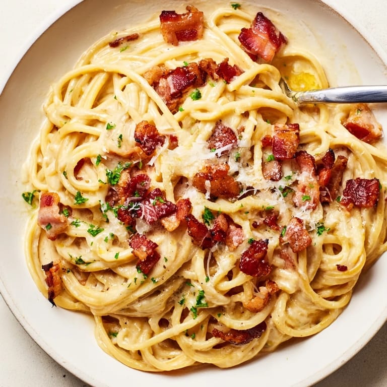 For a vegetarian version, omit bacon and use sautéed mushrooms. Substitute pancetta for bacon for a more traditional flavor. Use Pecorino Romano cheese instead of Parmesan for a sharper taste. Pair with a crisp white wine like Pinot Grigio.