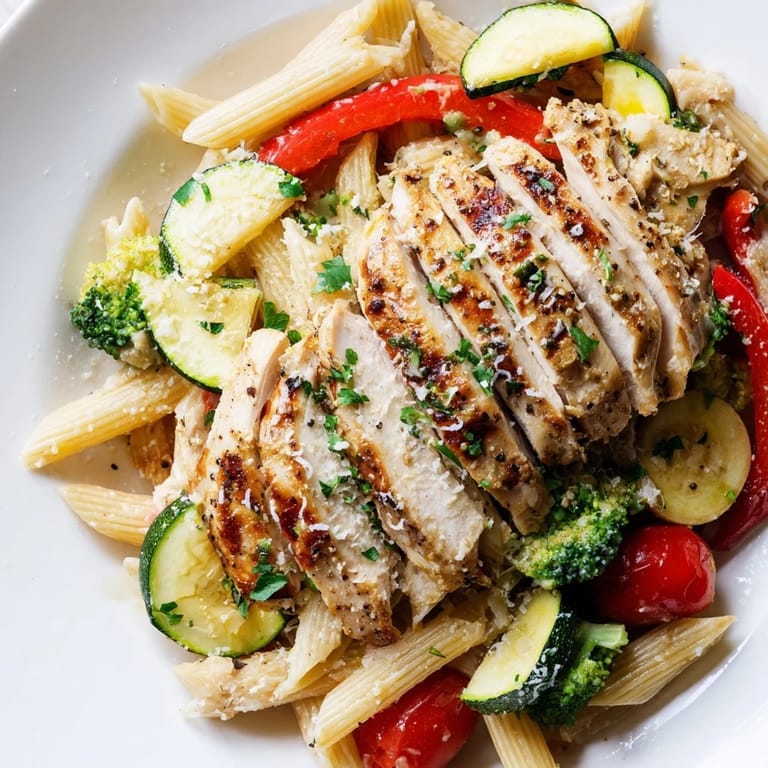 - In a large skillet over medium heat, toss together cooked pasta, roasted vegetables, sliced chicken, and reserved pasta water.