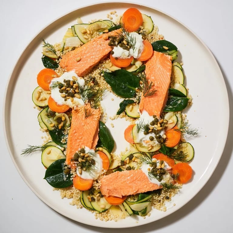 - This is where you become an artist. On a large platter, spoon your couscous in a loose figure-eight shape, letting it meander naturally. Now comes the meditation of arrangement: drape your vegetable ribbons along the curves, alternating zucchini, carrot, and fennel so the colors play against each other. Tuck the spinach into the softer sections. Nestle your salmon flakes into the curves where they'll catch the light. Dot the yogurt dressing at intervals like tiny clouds. Finally, scatter those toasted pine nuts across the top like you're adding stars to a night sky. Step back. You've just created something beautiful.