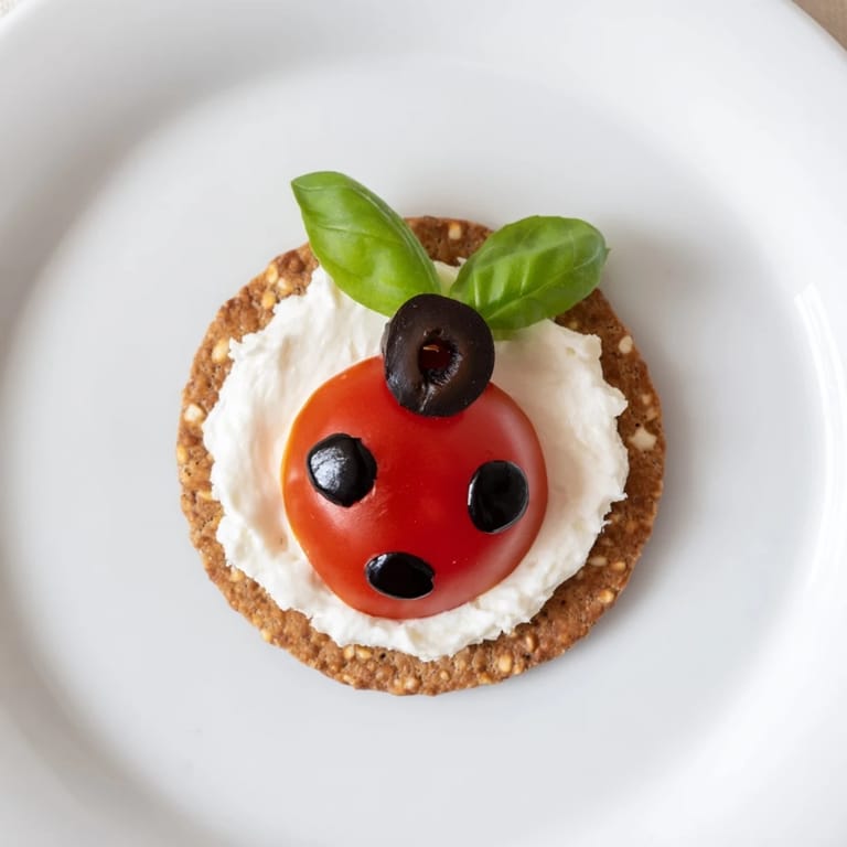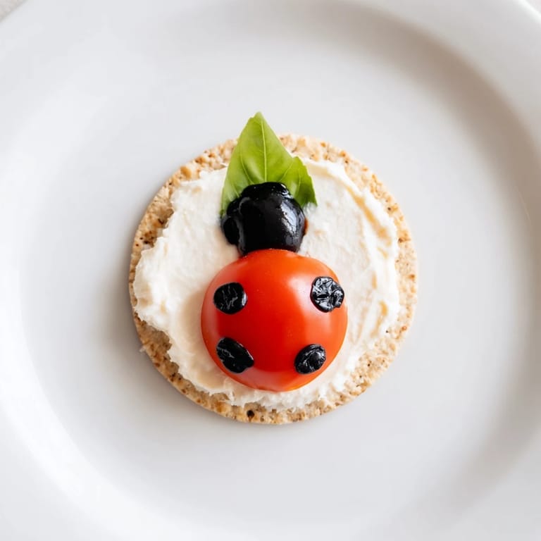 Spread cream cheese on crackers, place a basil leaf, add a halved cherry tomato for the body, and a black olive half for the head. Finish with balsamic glaze dots to mimic spots.