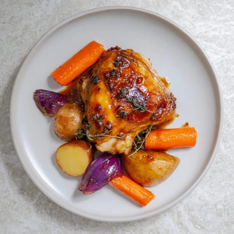 While baby potatoes, carrots, and red onion work beautifully together, this glaze is forgiving enough to adapt to whatever's in season or what you have on hand. I've roasted it with Brussels sprouts that get crispy and caramelized at the edges, with parsnips that turn almost candy-sweet in the heat, and once with a mix of root vegetables that made the whole pan taste like autumn. The vegetables are there to soak up the drippings and cook alongside the chicken, so as long as you cut them into similar-sized pieces, you're golden.