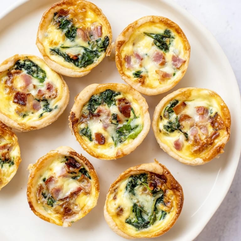 - Bake for 18–22 minutes or until quiches are puffed and golden. Let cool 5 minutes; carefully remove from tins.