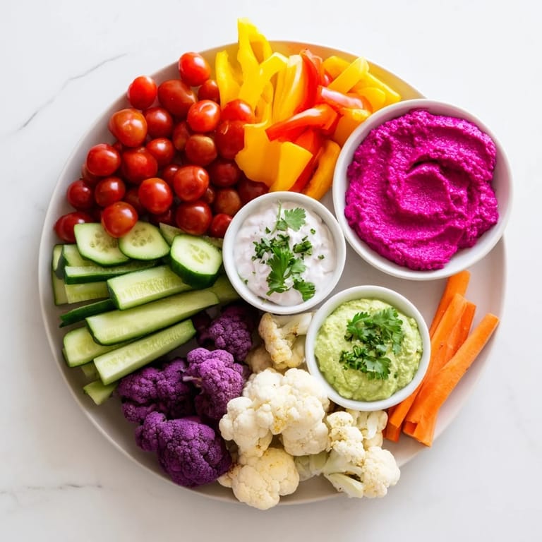 Arrange the vegetables in sections to highlight the rainbow colors and place the three dips in small serving bowls around the platter for easy access and appealing presentation.
