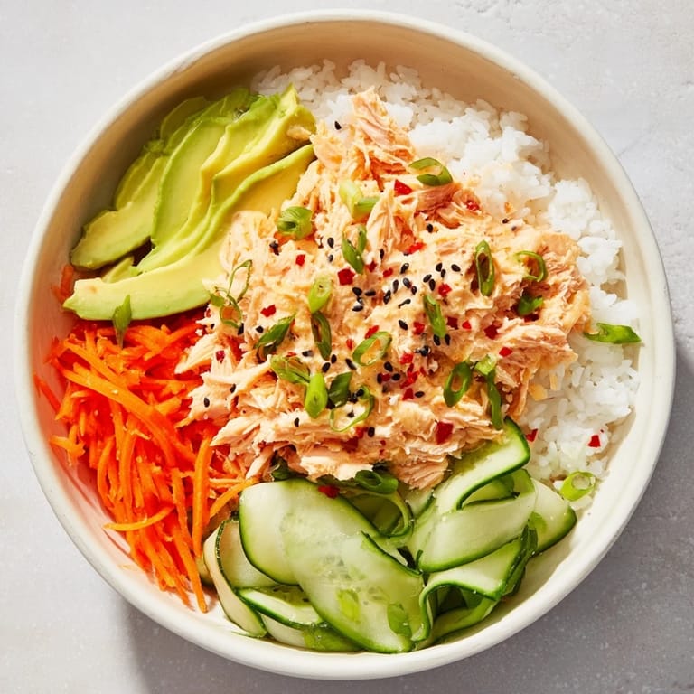 Save There's something about opening a can of salmon on a Tuesday afternoon that shifts the whole mood of lunch from ordinary to exciting. I was rushing between tasks, standing in my kitchen with an empty stomach, when I spotted that salmon can in the pantry and thought, why not build something actually interesting? Ten minutes later, I was spooning creamy sriracha mayo over fluffy jasmine rice, and the kitchen smelled like toasted sesame and fresh ginger. That impromptu bowl became a regular rotation ever since.