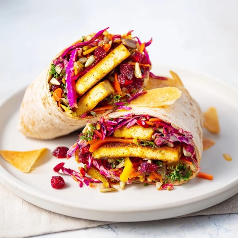 Save A vibrant, crispy wrap featuring sweet chili-glazed tofu, crunchy vegetables, and a festive slaw—perfect for a plant-based holiday meal or a flavorful weeknight dinner.